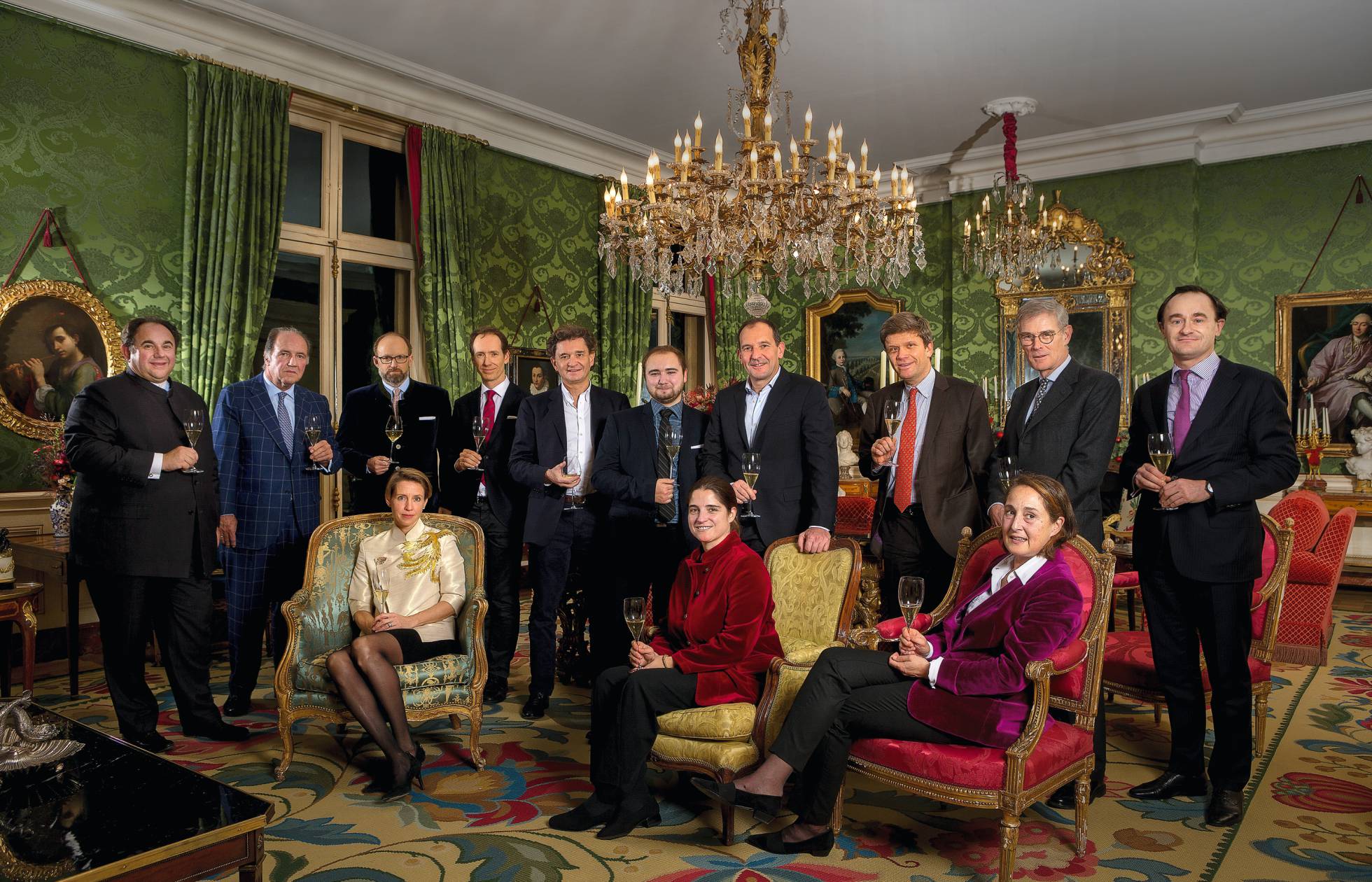 Los miembros de Primum Familiae Vini, fotografiados en el palacete parisiense del príncipe Roberto. En la fila de atrás, de izquierda a derecha, Hubert de Billy, Pablo Álvarez, Roberto de Luxemburgo, Miguel Torres Maczassek, Philippe Sereys de Rothschild, Jean-Frédéric Hugel, Marc Perrin, Frédéric Drouhin, Paul Symington y Julien de Beaumarchais de Rothschild. Sentadas, Valeska Müller, Priscilla Incisa della Rochetta y Albiera Antinori. MANUEL VÁZQUEZ.