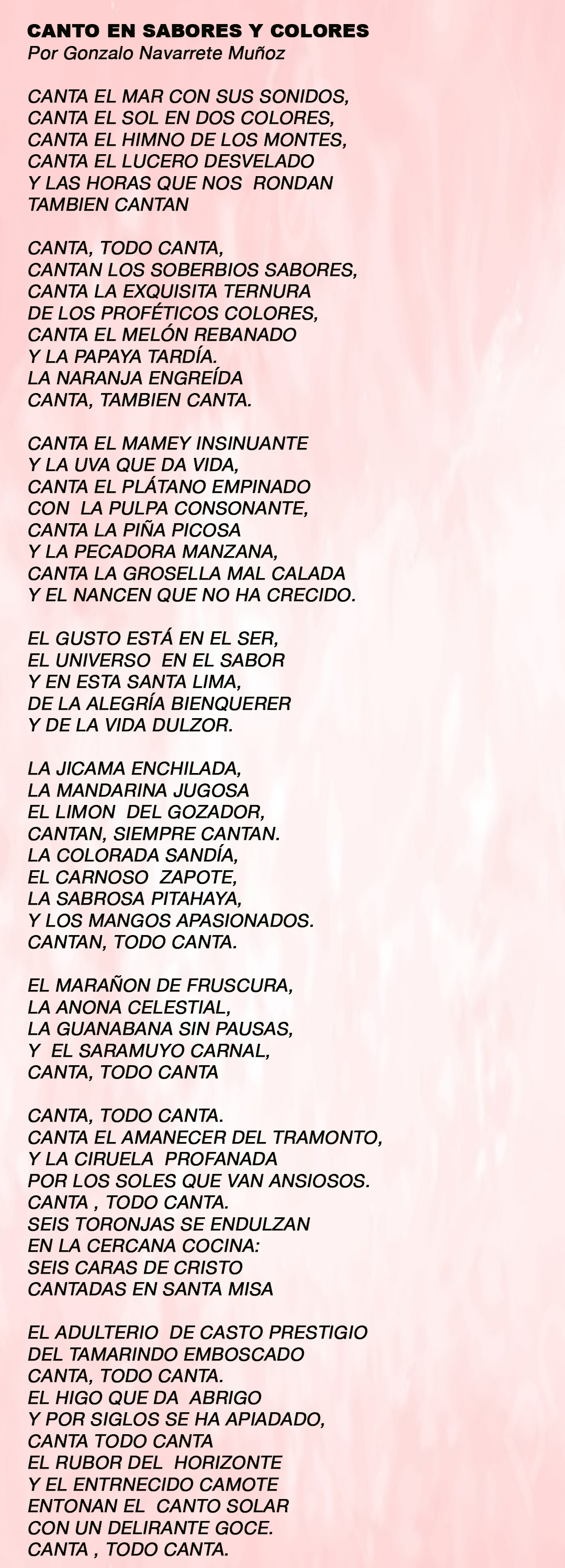 CANTO EN SABORES Y COLORES Publicado por meridadeyucatan.com | Nov 10, 2017 | Poetas y Poesía Yucateca Comparte esto: Haz clic para compartir en X (Se abre en una ventana nueva) X Haz clic para compartir en Facebook (Se abre en una ventana nueva) Facebook Haz clic para compartir en WhatsApp (Se abre en una ventana nueva) WhatsApp Publicaciones relacionadas: EVENTO FILEY 2019. LOS SECRETOS DEL CHEF, EQUILIBRIO ENTRE SABORES, TEXTURAS Y COLORES. EVENTO FILEY 2019. «LOS SECRETOS DEL CHEF, EQUILIBRIO ENTRE SABORES, TEXTURAS Y COLORES» TUIT: EL ALMA ESTA HECHA CON COLORES DR. GILBERTO SIERRA CANTO DRA. JUDITH ELENA ORTEGA CANTO