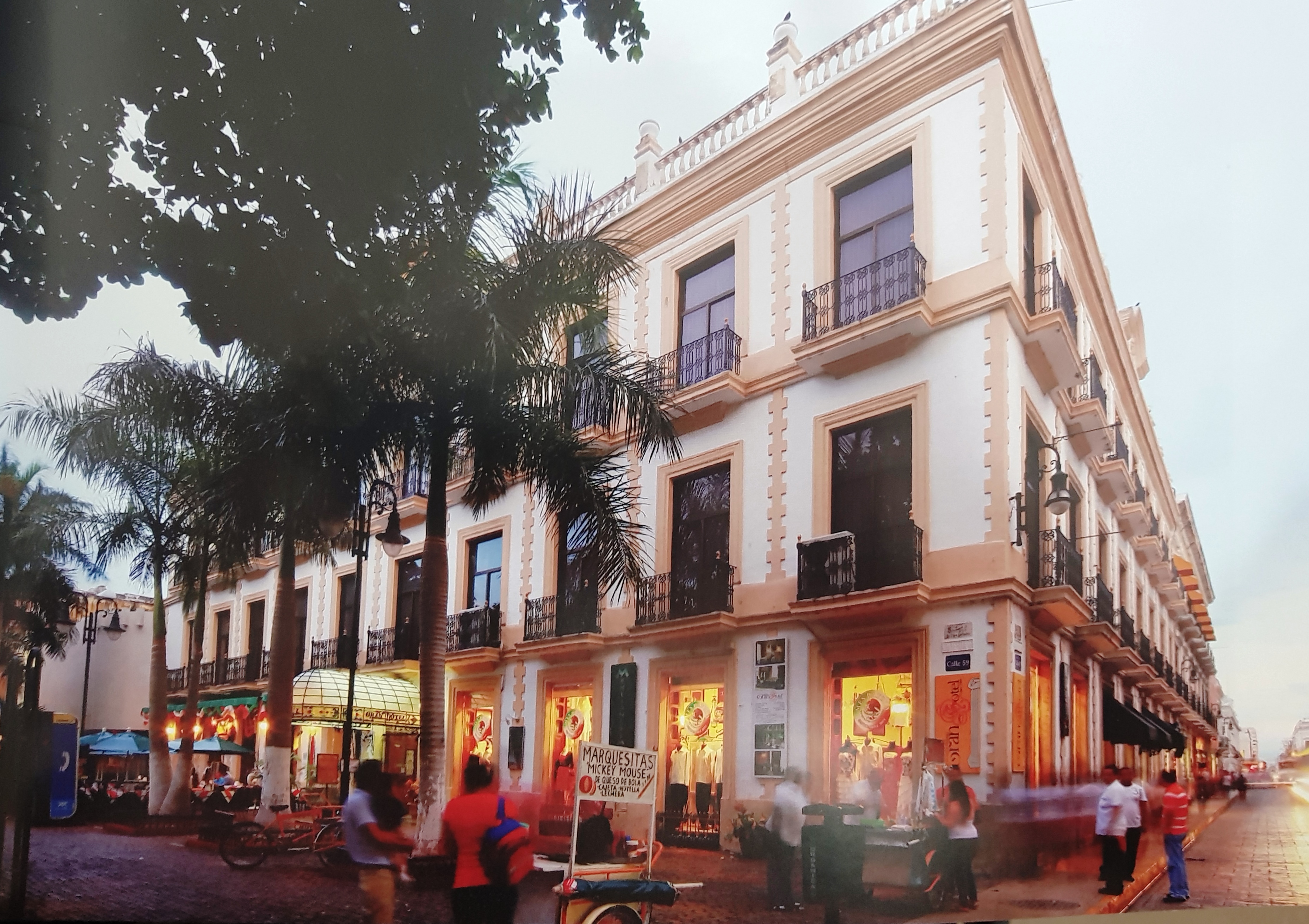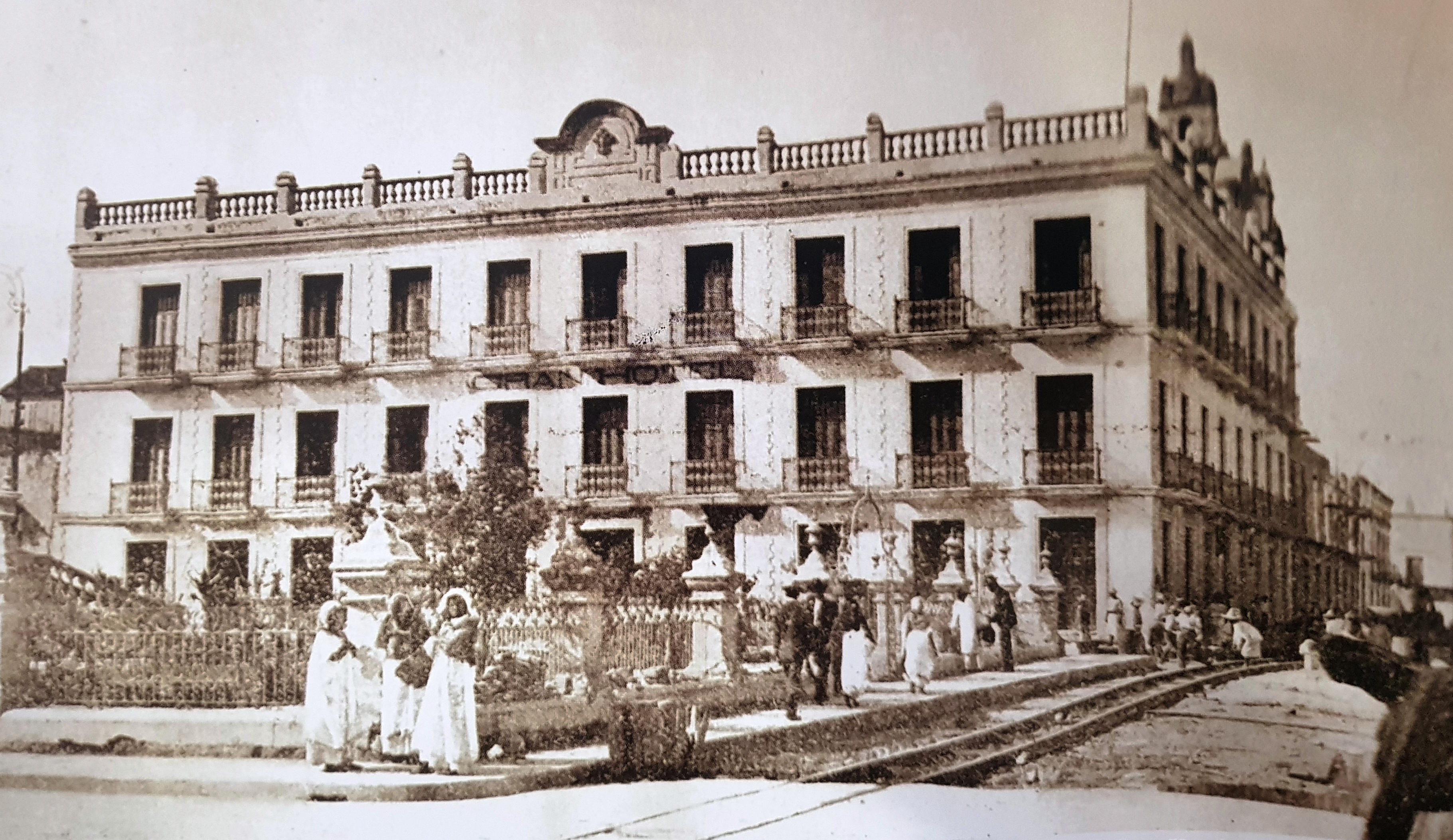 Esta foto nos muestra el primer hotel que en Mérida tuvo un edificio construido especialmente con este fin. El Gran Hotel sigue funcionando, lo que es digno de celebración. A pesar de haberse edificado en plena «Bella Época» no acusa un estilo ecléctico, ni ornamentación excesiva, más bien, para su tiempo, puede considerarse austero.